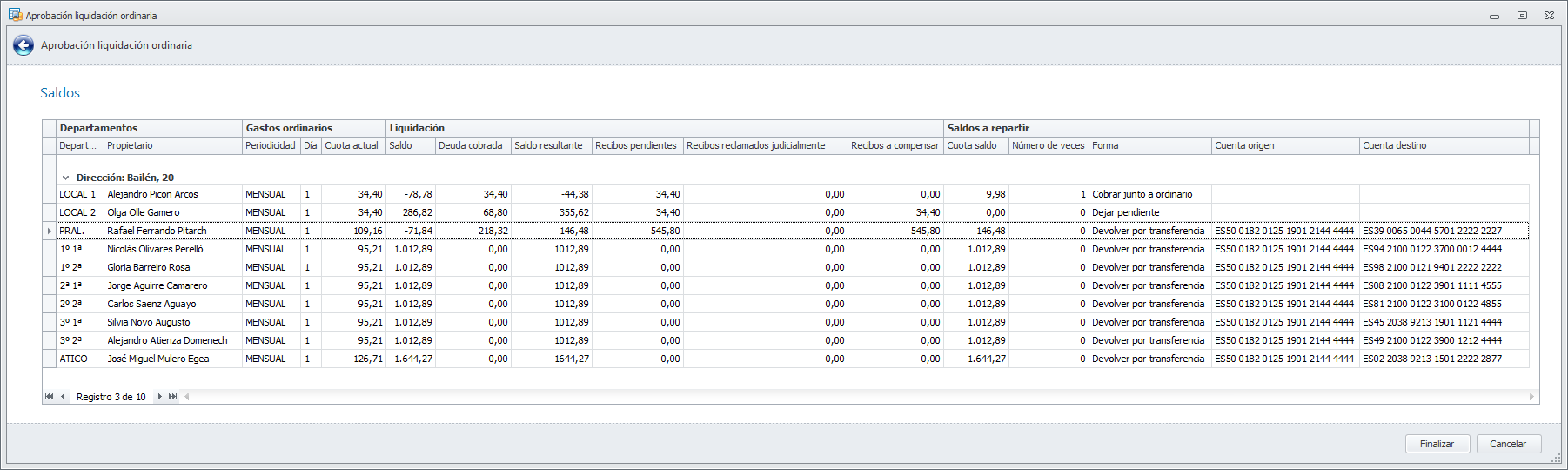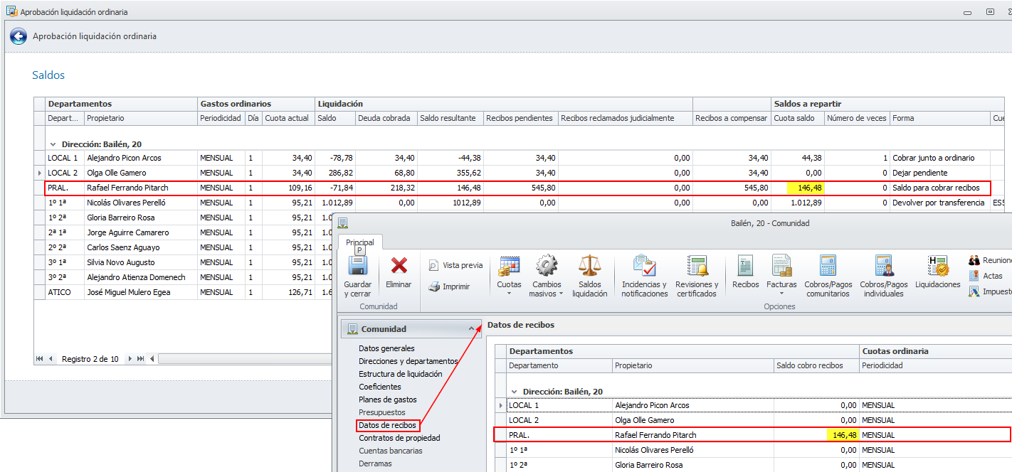 Para aquellos propietarios a los que se haya decidido usar el saldo para el cobro de próximos recibos, se guardará el importe en la ficha de la comunidad, vinculada al departamento.