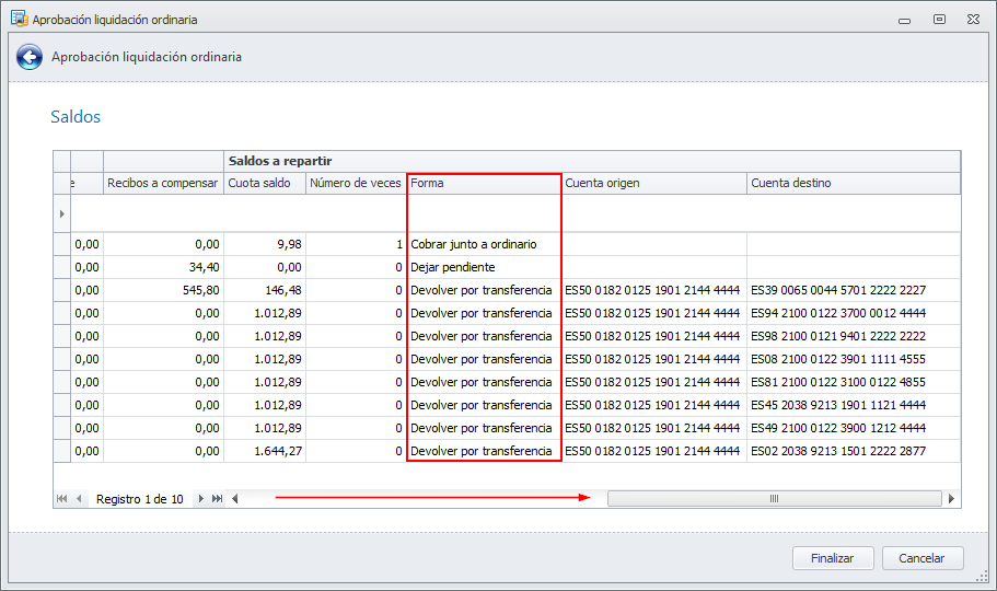 Saldo a regularizar: Importe que se ha usado para la regularización de saldos. Coincide con la columna Saldo resultante de la ventana de aprobación de la liquidación.