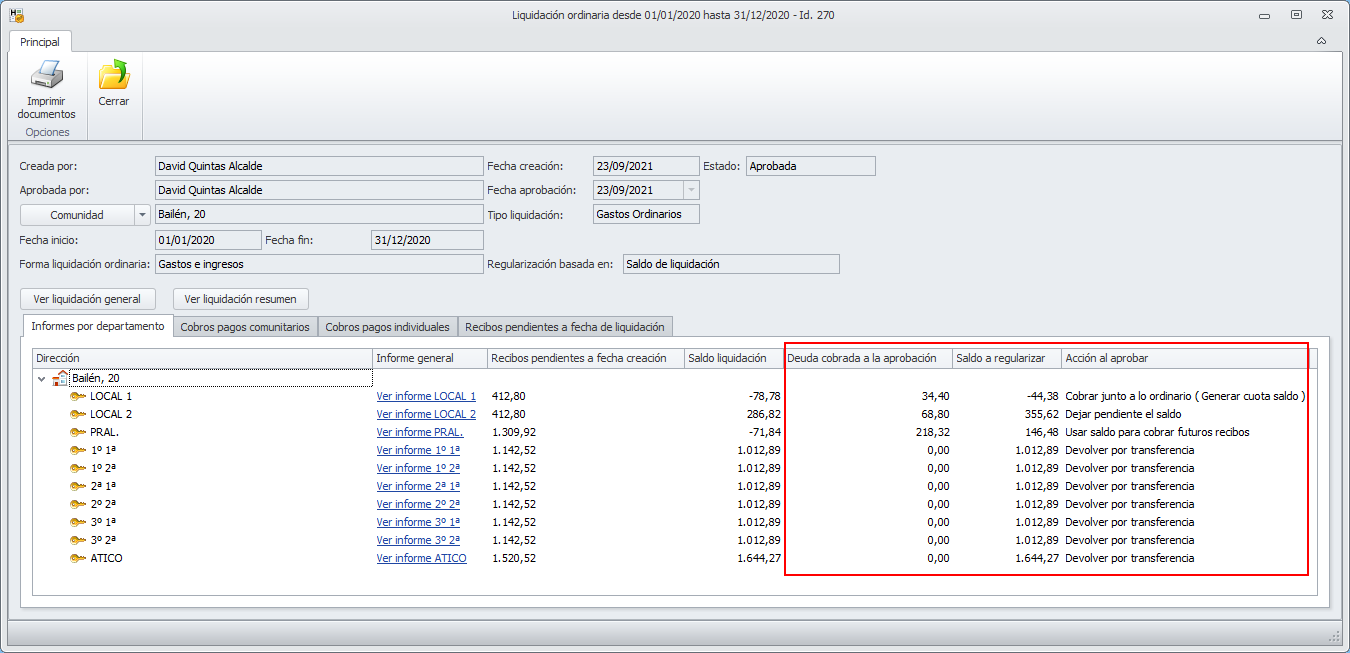 Estos datos sólo se mostrarán si la comunidad gestiona los saldos por departamento, su tipo de liquidación es de Gastos e ingresos. y la liquidación se ha emitido con una versión 2021.09.10 o posterior.