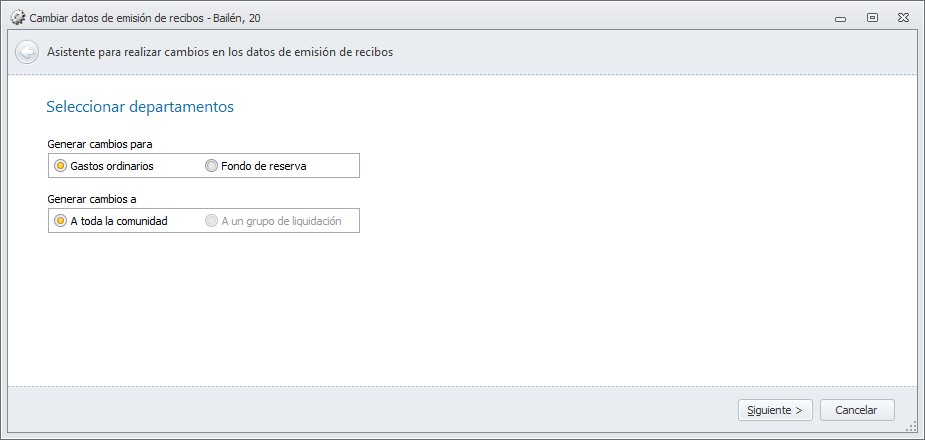 Este botón abre un asistente que le solicita si el cambio se desea realizar para las cuotas de gastos ordinarios o las de fondo de reserva. En el caso de que la comunidad tenga varios grupos de liquidación, se podrá escoger el grupo al que aplicar el cambio, pudiendo también escoger toda la comunidad.