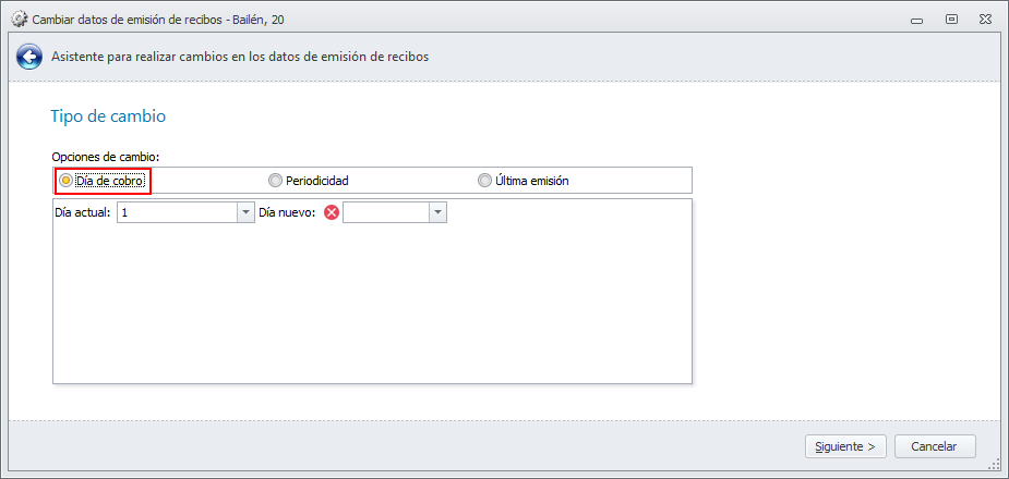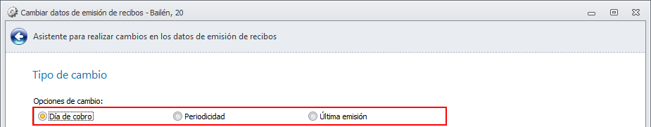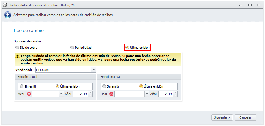 Si en Emisión actual escoge Sin emitir, se cambiará la última emisión de aquellas cuotas que todavía no se hayan emitido.