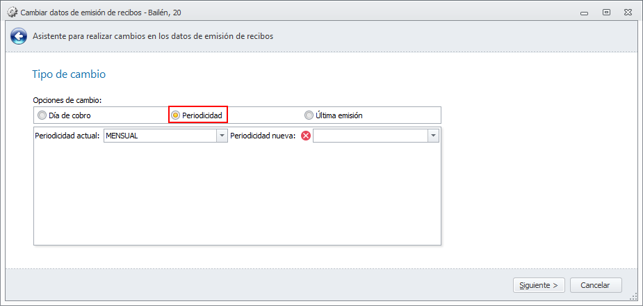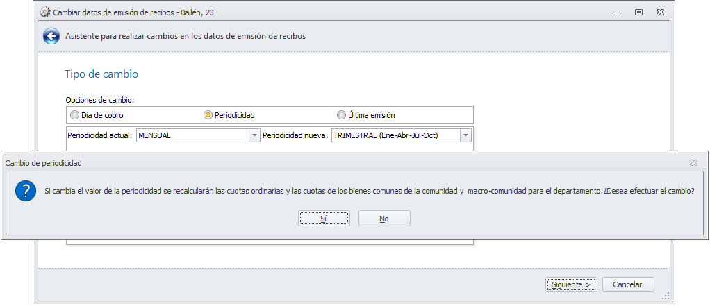 Tras hacer clic en el botón Siguiente, si el cambio de periodicidad implica que el número de recibos anual varía para algún departamento, se muestra el siguiente mensaje: