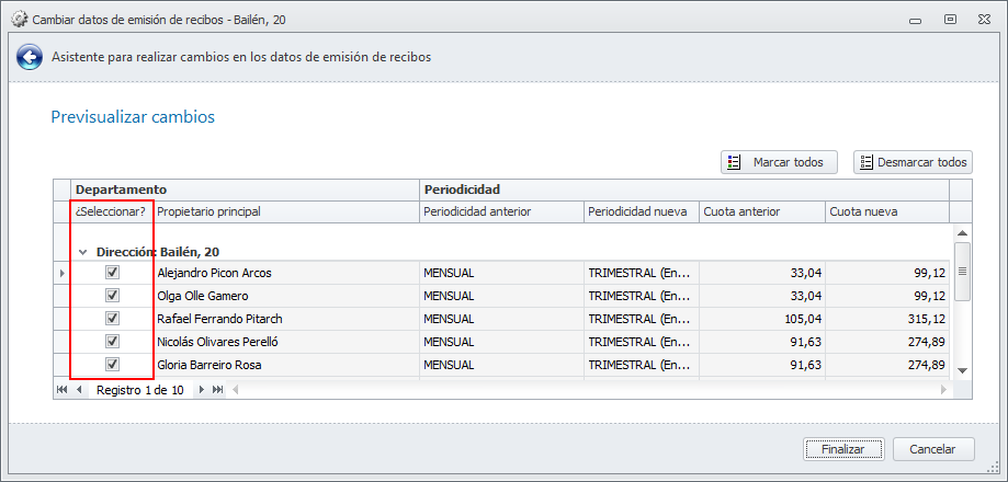 Se muestran los propietarios que cumplen las condiciones para el cambio solicitado y el nuevo valor que se le asignará. En el caso de cambiar la periodicidad, también indicará la cuota anterior y la cuota resultante del cambio.