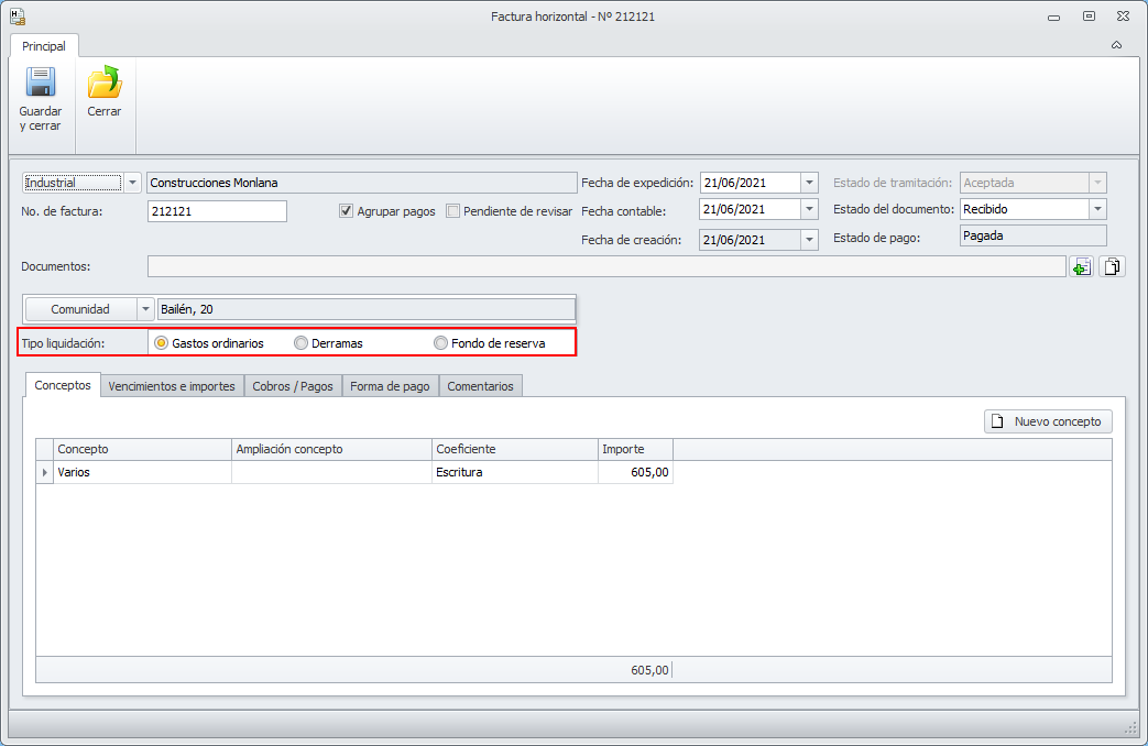 Para cambiar el tipo de liquidación debe accederse a la ficha de la factura. Se podrá cambiar siempre y cuando esta factura no esté ya liquidada.