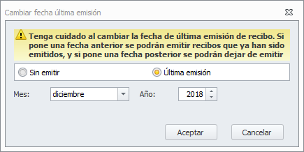 Debe tener mucho cuidado si manipula este dato, ya que puede provocar la repetición de recibos que ya haya emitido (si pone una fecha anterior) o la no emisión de algún recibo (si pone una fecha posterior).
