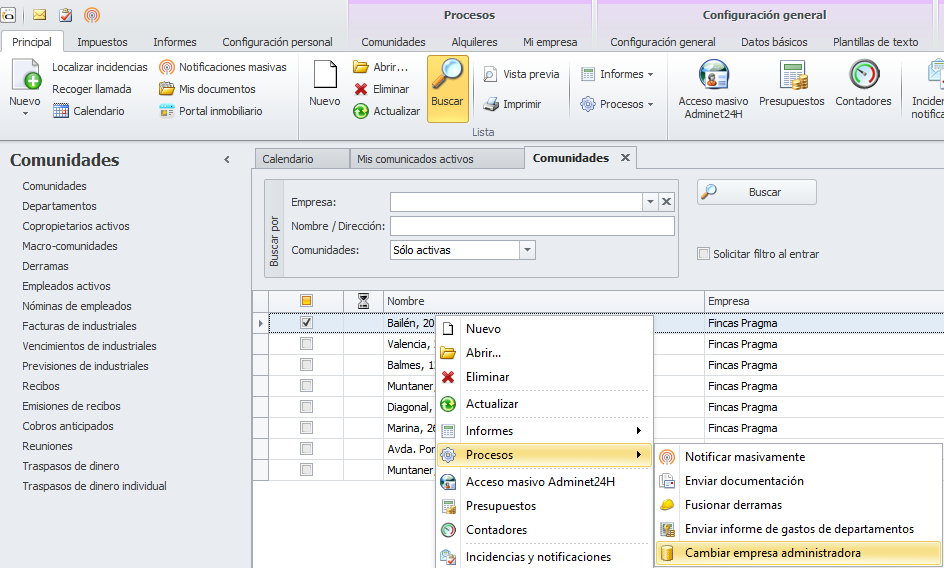 Para cambiar la empresa administradora de una comunidad, haga clic derecho sobre la comunidad y escoja Procesos y Cambiar empresa administradora.