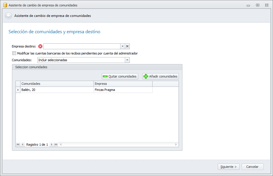 Empresa destino. Escoja la empresa a la que se va a transferir la gestión de la comunidad.