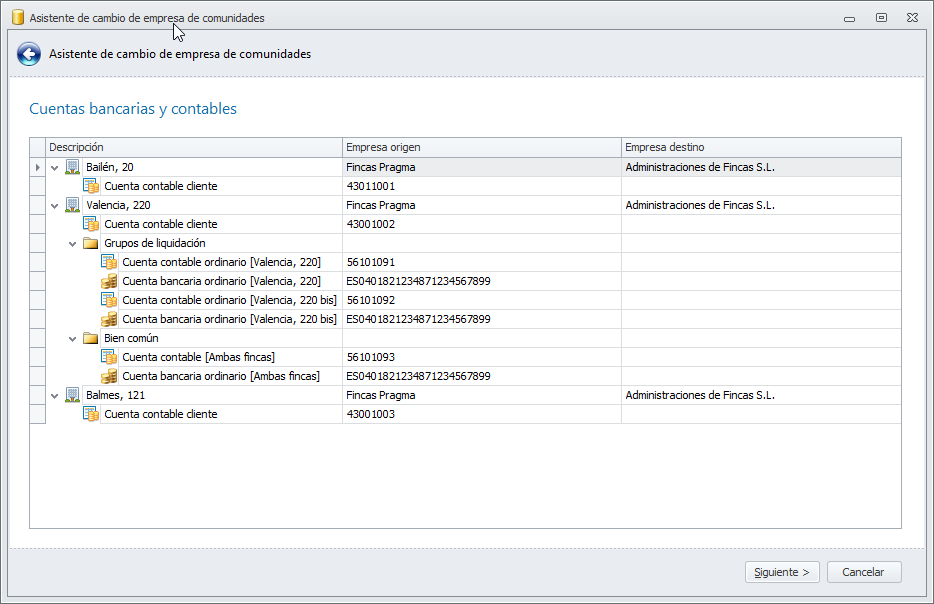Al hacer clic en Siguiente se analiza el detalle de las comunidades a traspasar (grupos de liquidación, bienes comunes, derramas, macrocomunidades) y si la empresa de destino tiene enlace contable. Se solicita por pantalla la cuenta contable y la cuenta bancaria a asignar para cada uno de los elementos, en una lista como la siguiente. Si la empresa de destino no tiene enlace contable y no hay cuentas bancarias a informar, esta ventana no se muestra.