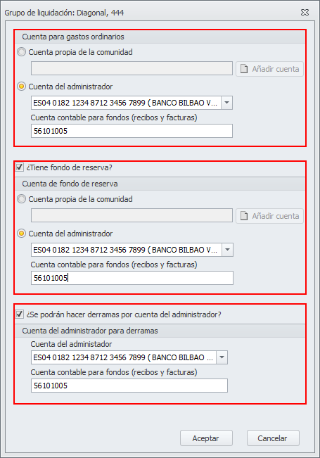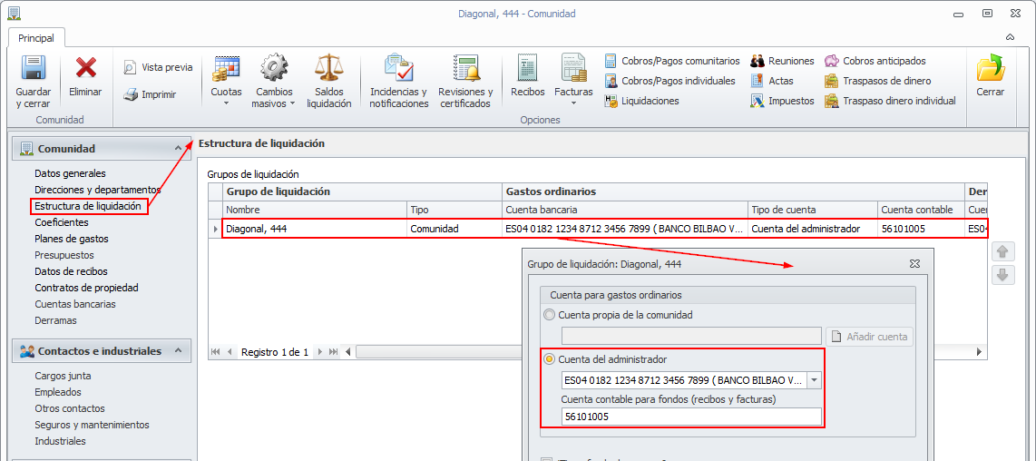 Acceda a la estructura de liquidación de la comunidad e indique que trabaja con cuenta de administrador. Si tiene activado el enlace contable del administrador debe indicar la cuenta de fondos para la comunidad.