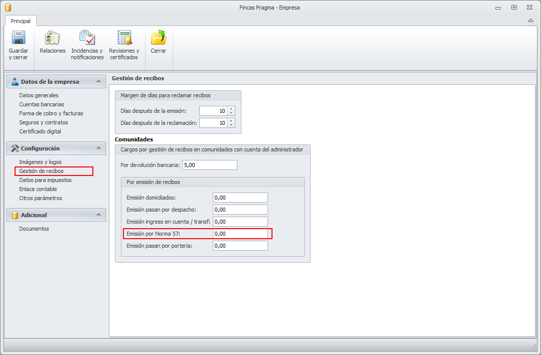 Para los recibos que sean emitidos por cuenta bancaria del administrador, el administrador puede, opcionalmente, añadir al recibo comisiones por gastos de emisión. Estos gastos de emisión se deben especificar en la sección Gestión de recibos de la ficha Empresa.