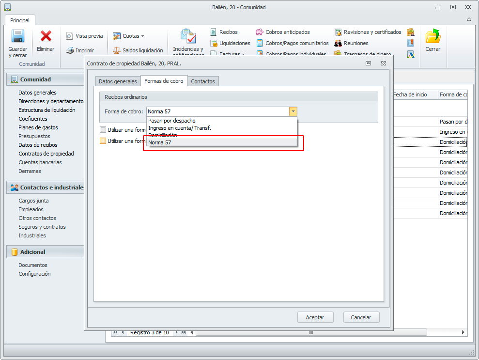 Activar forma de cobro Norma 57 en contratos de propiedad