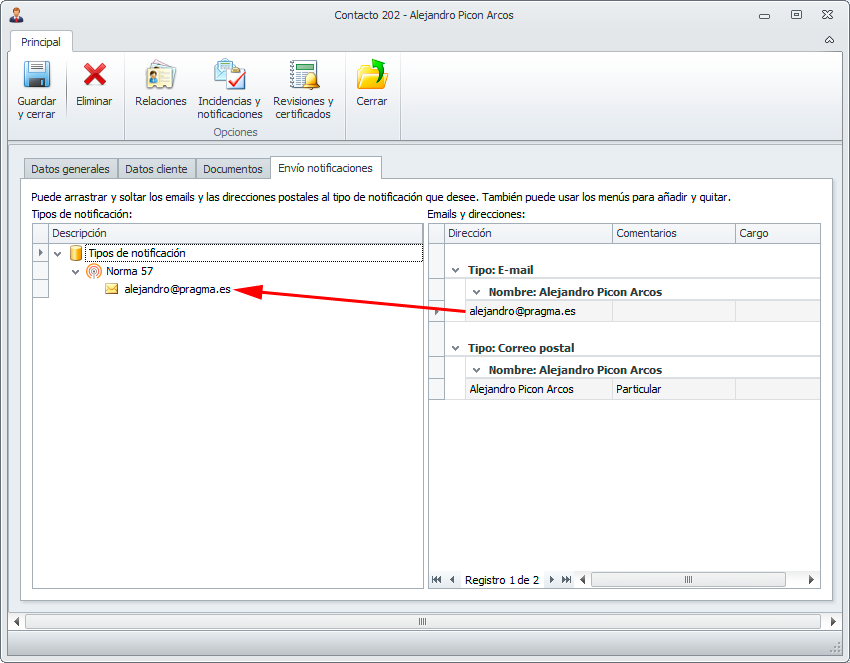 En la ficha del contacto correspondiente al copropietario, se puede prefijar una forma de envío específica por cada tipo de notificación. Si desea que a un propietario concreto se le remita la notificación por una forma de envío concreta, especifíquelo. Para especificar la forma de envío de la Norma 57, debemos arrastrar desde Emails y direcciones el mail o dirección postal hacia el nodo Norma 57. Esto predeterminará a este contacto con esta forma de envío para Norma 57.