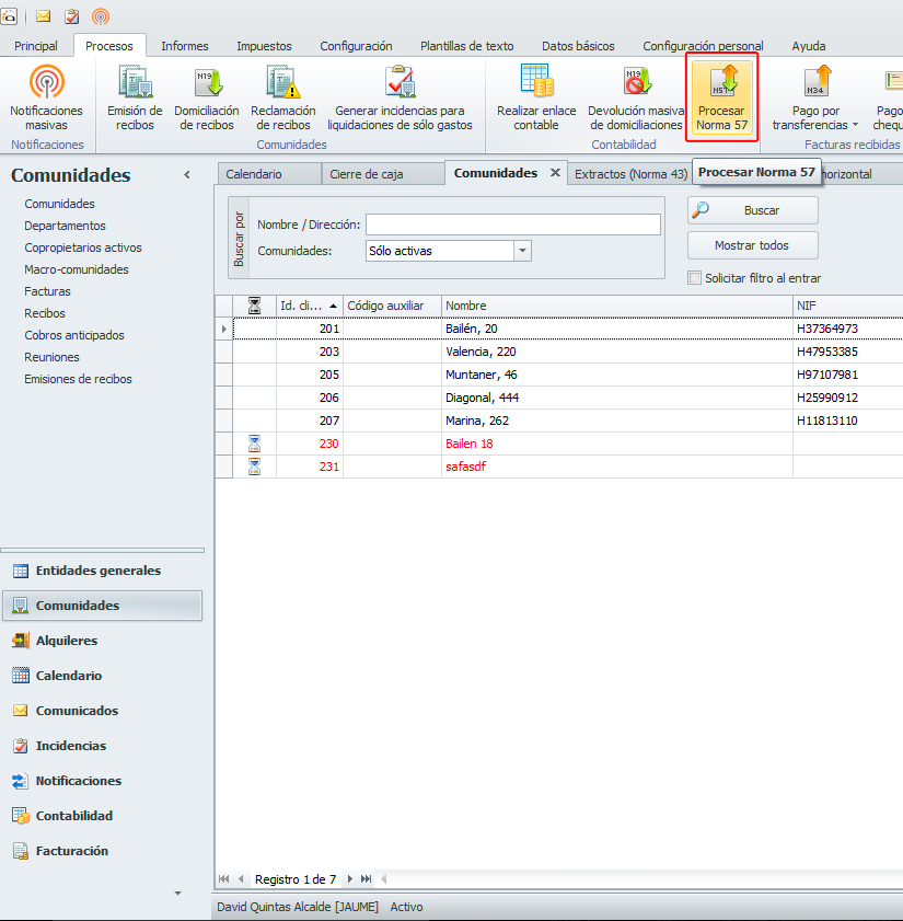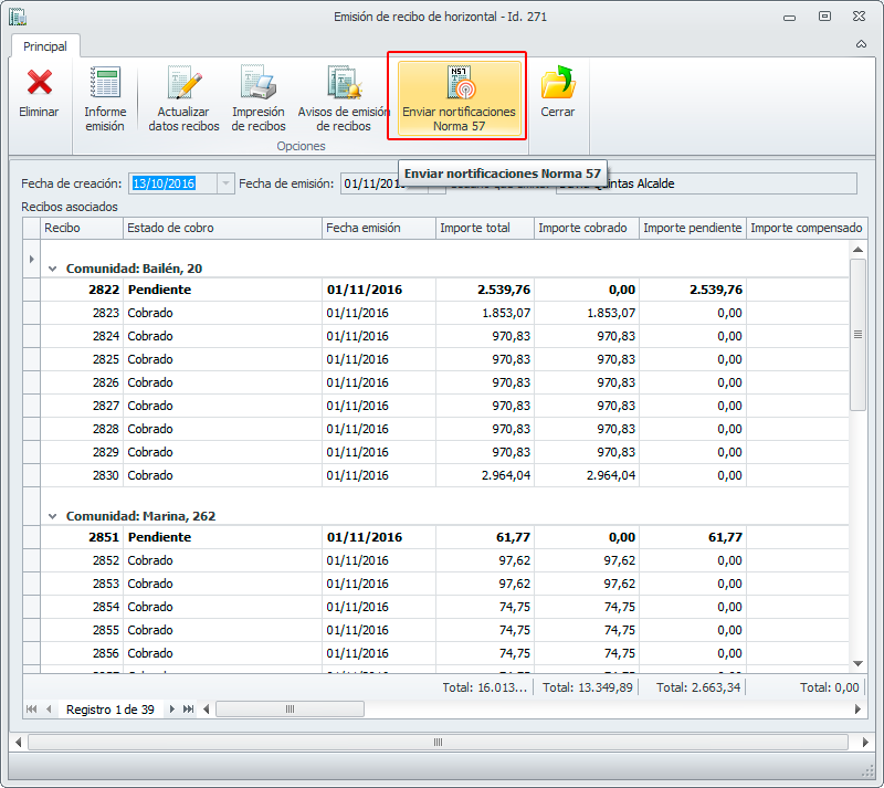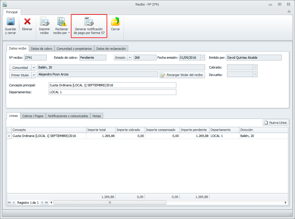 Desde un recibo pendiente o devuelto, independientemente de su forma de cobro, también puede imprimir el documento de pago, usando el botón Generar notificación de pago por Norma 57. De este modo puede emitir este documento de pago para cualquier propietario que tiene recibos pendientes, redirigiéndolo a la entidad bancaria correspondiente.