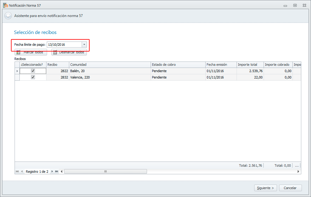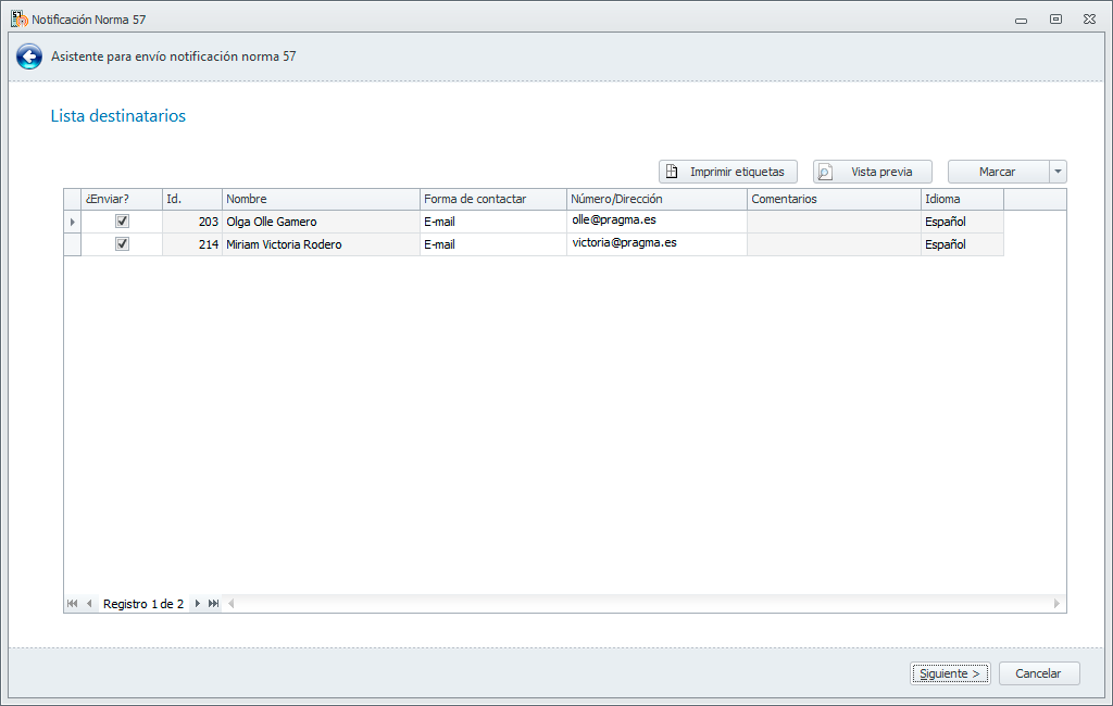 Al finalizar este asistente, se imprimirán las cartas de pago Norma 57 para los envíos postales y se enviarán por email a aquellos destinatarios que así lo tengan marcado.