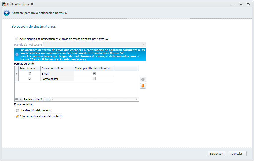 Al preparar el envío, para cada propietario, adminet analizará si tiene en su ficha de contacto una forma de notificación predeterminada para la Norma 57. Si la tiene, usará esa forma de envío. Si no, utilizará la especificada en el asistente.