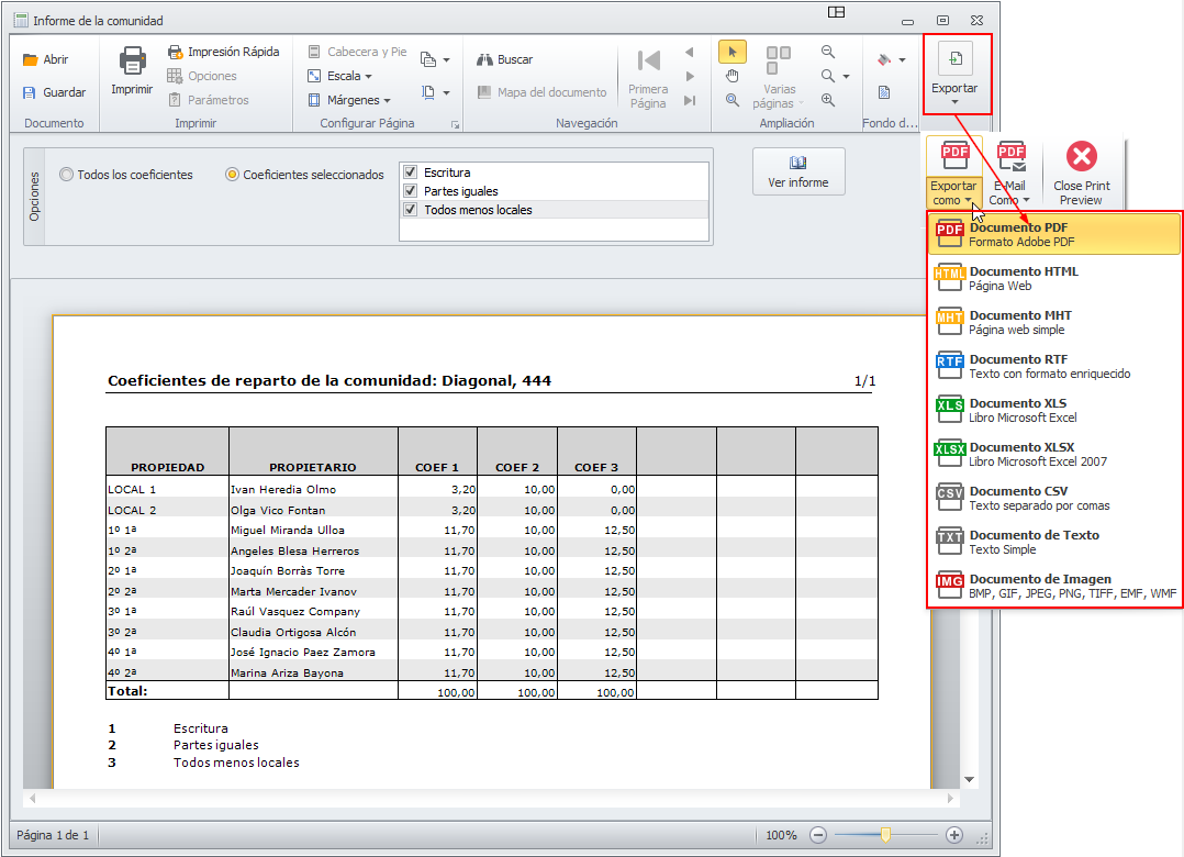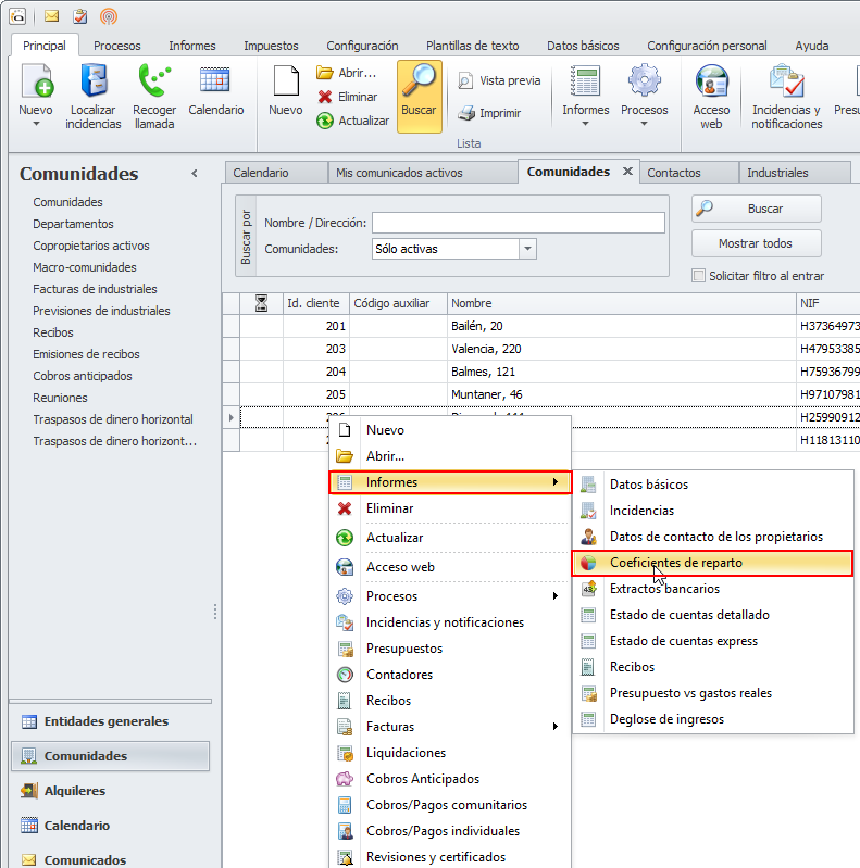 Se accede haciendo clic derecho sobre la comunidad y escogiendo la opción Informes->Coeficientes de reparto.