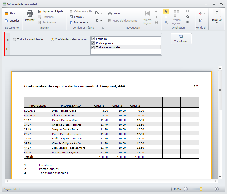 Una vez dentro de la ventana del informe, puede escoger entre mostrar todos los coeficientes o marcar aquellos que desea mostrar. Vea un ejemplo de como sería un informe de coeficientes de reparto.