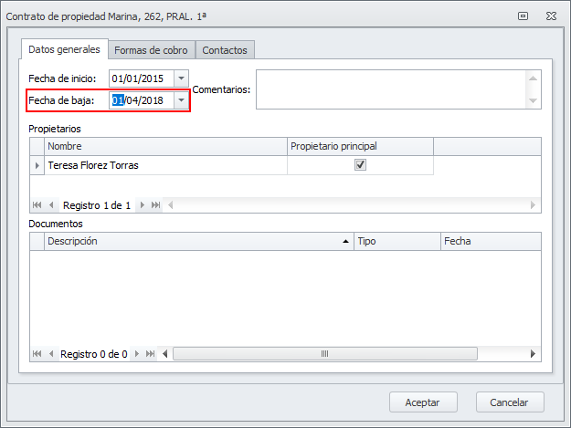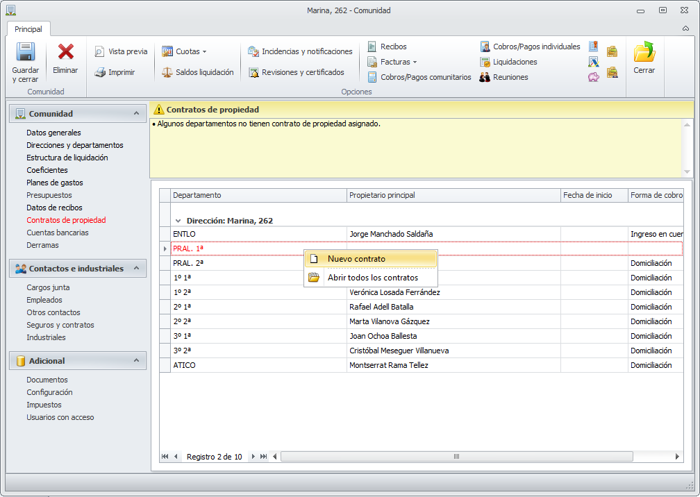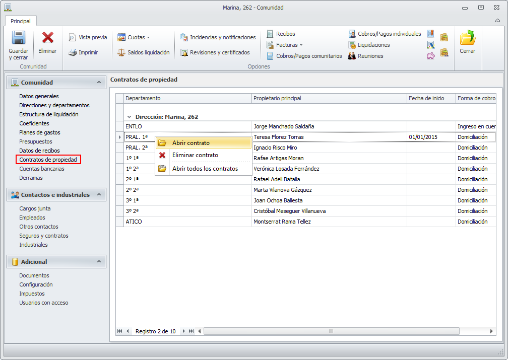 Si se desea cambiar el propietario de un departamento, lo primero a hacer es dar de baja el propietario actual. Acceda a la comunidad y sitúese en la sección Contratos de propiedad. Haga clic derecho sobre el contrato de propiedad que desee dar de baja. Escoja Abrir contrato.