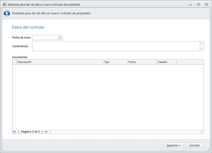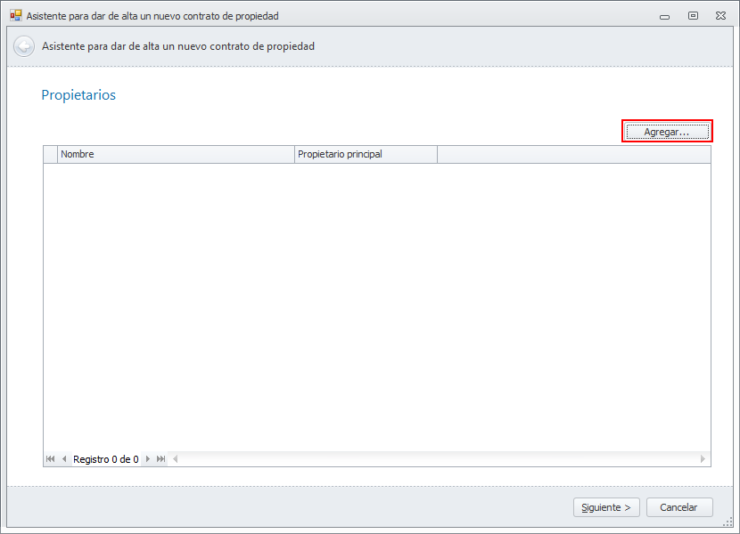 Se abre el asistente para dar de alta un nuevo contrato de propiedad asociado a ese departamento. Con el botón Agregar añada todos los titulares de ese contrato de propiedad. Cuando los haya añadido, haga clic en Siguiente.