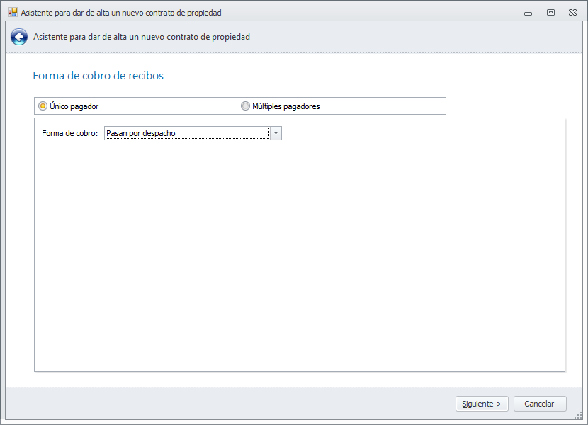 En la siguiente ventana, indique la forma de cobro de los recibos de este propietario. Haga clic aquí si desea ver con más detalle cómo identificar múltiples pagadores.