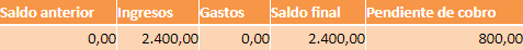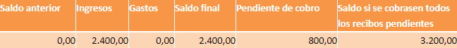 En el ejemplo el saldo final es de 2400. El pendiente de cobro son 800 y la suma total es de 3200€. De este modo calculamos el saldo total que tendría la comunidad si se cobrasen todos los recibos pendientes.