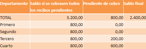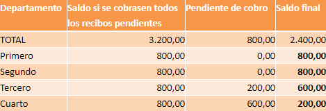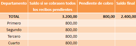 Al Saldo si se cobrasen todos los recibos pendientes, se le debe restar el importe Pendiente de cobro para calcular el Saldo final de cada departamento.