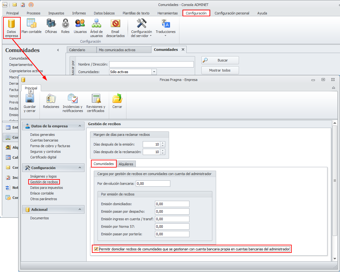 Para empezar a aplicar este método, lo primero a hacer es acceder a la ficha de Empresa, situarse en la sección Gestión de recibos y activar la casilla Permitir domiciliar recibos de comunidades que se gestiona con cuenta bancaria propia en cuentas bancarias del administrador.
