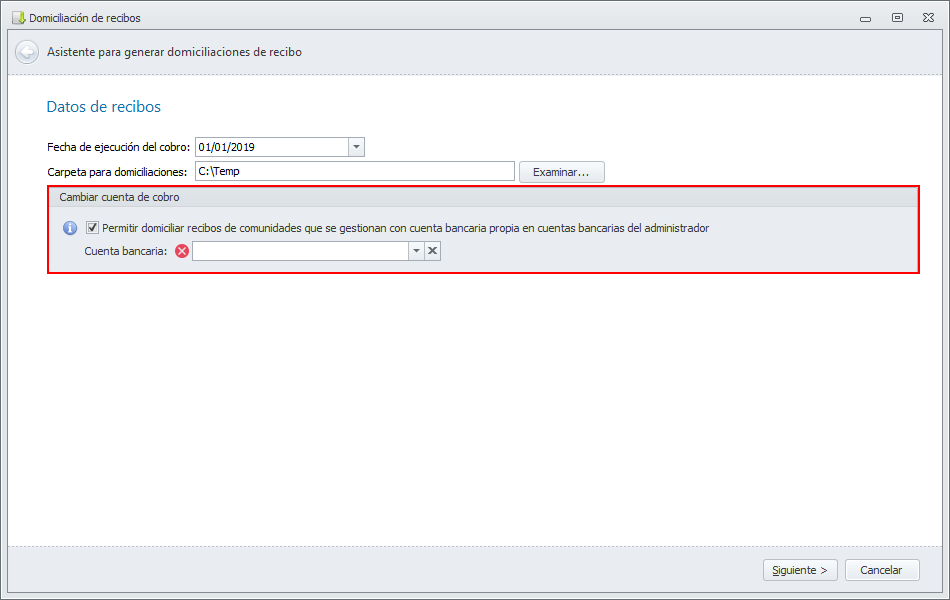 Si en la ventana del asistente desactiva la casilla Permitir domiciliar recibos de comunidades que se gestiona con cuenta bancaria propia en cuentas bancarias del administrador, los recibos que se incluyan en este asistente se domiciliarán en la cuenta bancaria de cada comunidad.