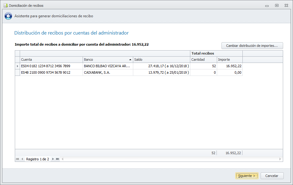 Avance con el asistente. Si el administrador tiene más de una cuenta bancaria se muestra la siguiente ventana para que pueda, si lo desea, distribuir el importe de la domiciliación entre sus diferentes cuentas.
