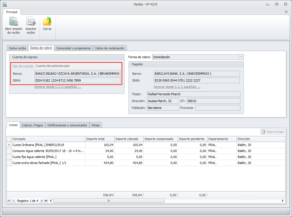 Si se consulta cualquiera de estos recibos, tienen indicado, en su pestaña Datos de cobro que se cobra en la cuenta del administrador.