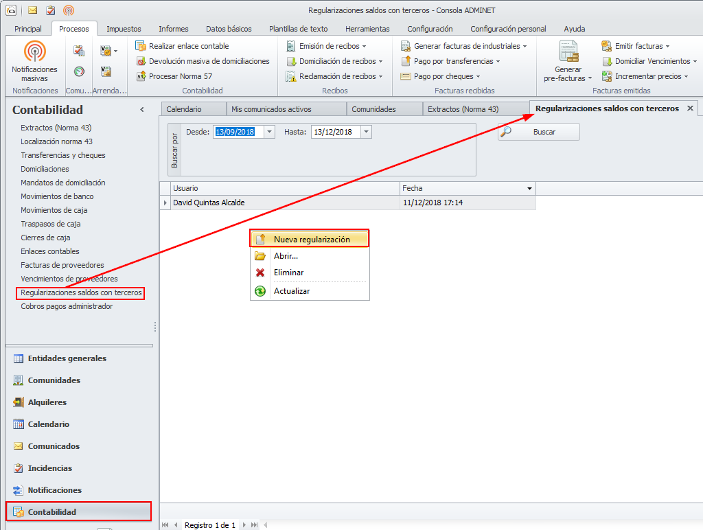 En el momento en que se desee transferir el dinero de estos recibos a las cuentas de las comunidades, se debe acceder al apartado Contabilidad y entrar en la opción Regularizaciones saldos con terceros. Hacer clic derecho y escoger Nueva regularización.
