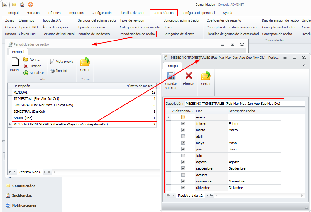 Lo primero que se debe hacer es comprobar si disponemos de esa periodicidad en nuestra instalación. Vamos al menú Datos básicos y escogemos Periodicidades de recibo.