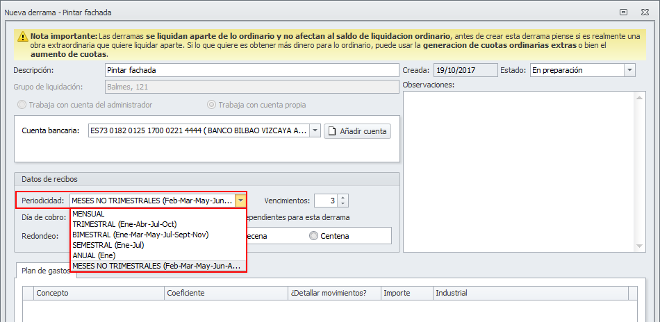 Cuando se da de alta la derrama se indica cuantos recibos se van a emitir y la periodicidad de los mismos. En ese momento es cuando se indica que se desea emitirlos con esa nueva periodicidad.