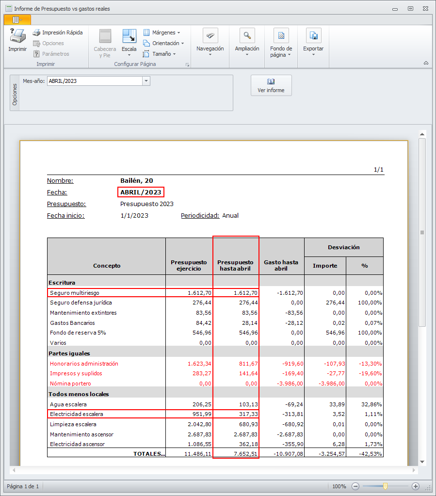 Para cada línea, el programa calcula la parte del presupuesto anual que corresponde al periodo comprendido entre enero y el mes escogido. Para ello, accede al plan de gastos de la comunidad y analiza en qué meses se registra el gasto para cada uno de los conceptos, dividiendo el importe presupuestado anual entre el número de veces en el que se paga y multiplicándolo por el número de veces que se debe haber pagado en el mes solicitado.