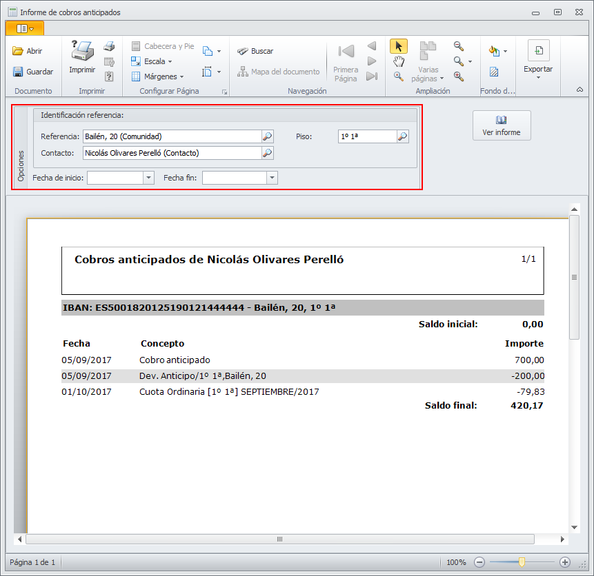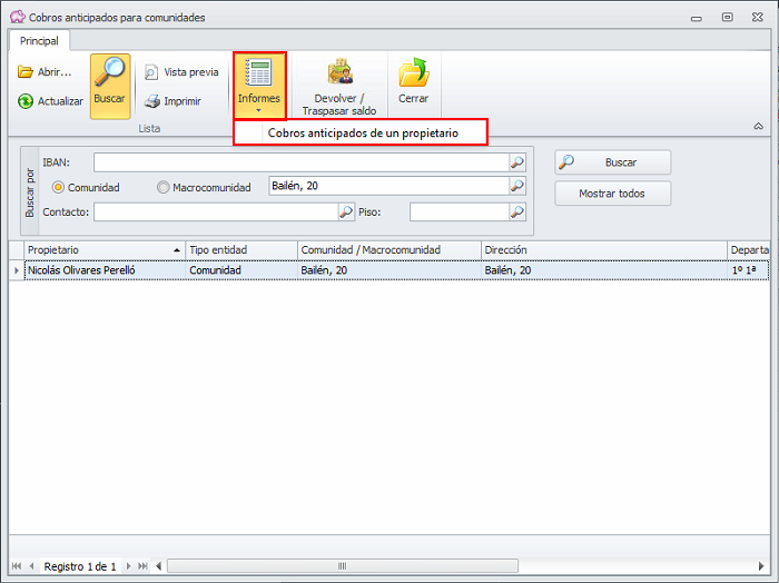El informe se obtiene desde la ventana principal de cobros anticipados. Se debe hacer clic en el botón Informes y escoger Cobros anticipados de un propietario.
