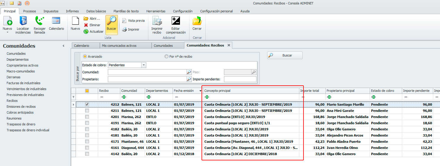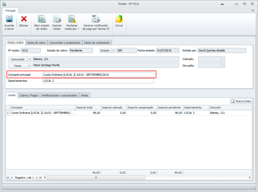 El concepto principal del recibo se compone concatenando los siguientes datos: Descripción del concepto + Descripción del departamento + Descripción del período + Descripción del bien común