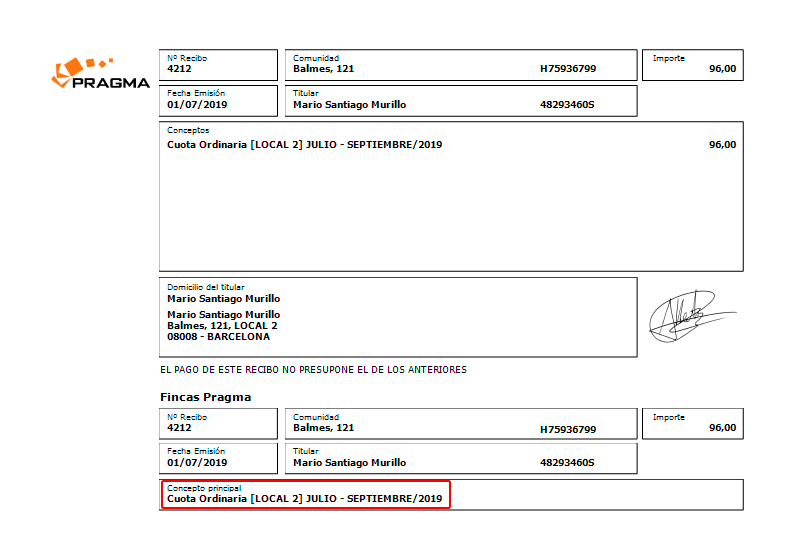 El contenido del campo Concepto principal del recibo es creado de forma automática por el sistema cuando se genera el recibo. A continuación puede ver un ejemplo.