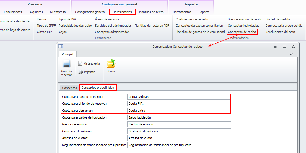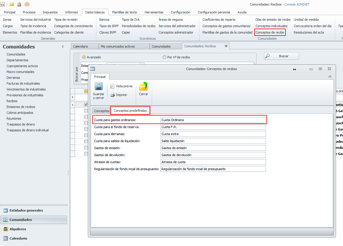 La descripción asociada a los conceptos de recibo Cuota para gastos ordinarios, Cuota para el fondo de reserva y Cuota para derramas se localiza en la tabla de conceptos de recibo de comunidades, como puede ver en la siguiente imagen.