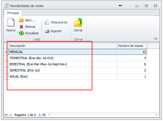 Es la descripción de la periodicidad del recibo. Es también un dato básico que se encuentra en Datos básicos->Periodicidades de recibo.