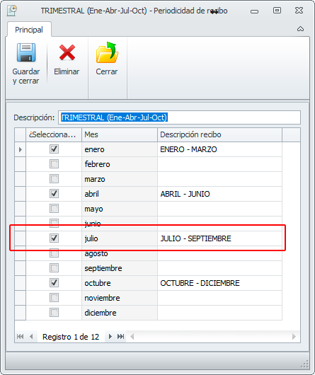 Al emitir el recibo, el programa accede a la ficha de la periodicidad correspondiente, para localizar el texto a asignar. Si hace doble clic sobre la periodicidad TRIMESTRAL (Ene-Abr-Jul-Oct) podrá ver la columna Descripción recibo en la que el literal del ejemplo corresponde al mes de julio.