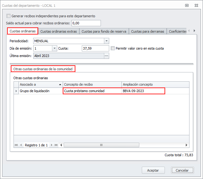 Para otras cuotas ordinarias, la descripción está compuesta por la descripción asociada al concepto de recibo usado en esa cuota más su ampliación de concepto.