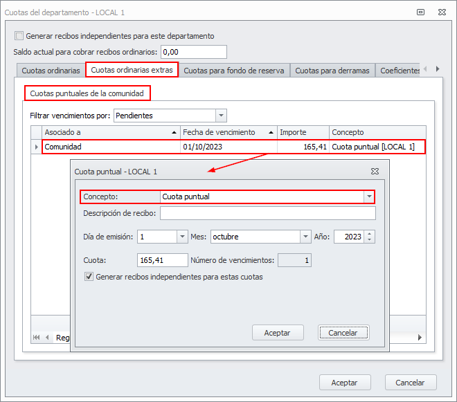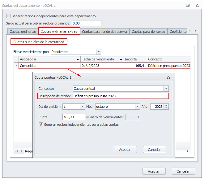 Si la cuota tiene descripción, la descripción del concepto es la descripción de la cuota. En el siguiente ejemplo, la descripción será Déficit en presupuesto 2023.