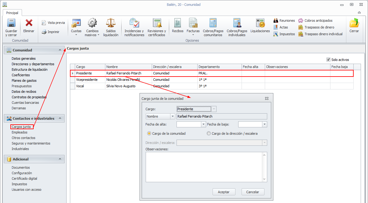 En la sección Cargos junta de la ficha de la comunidad, se muestran los datos de los representantes de la misma.
