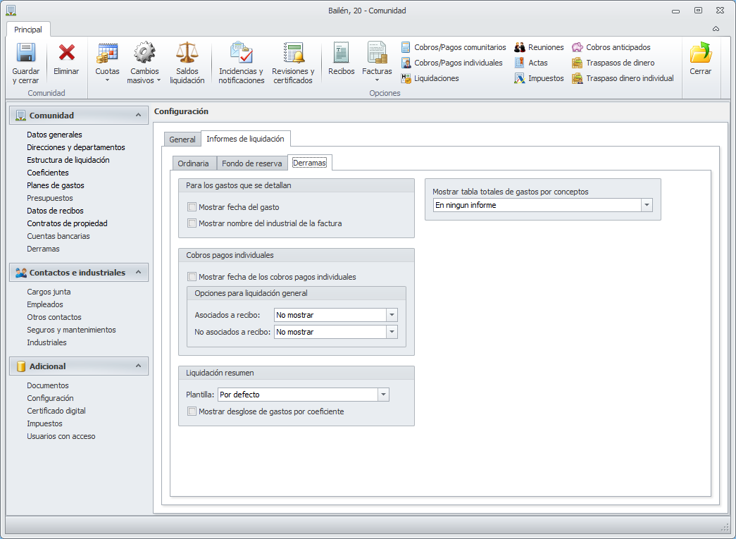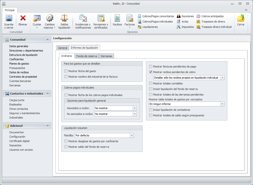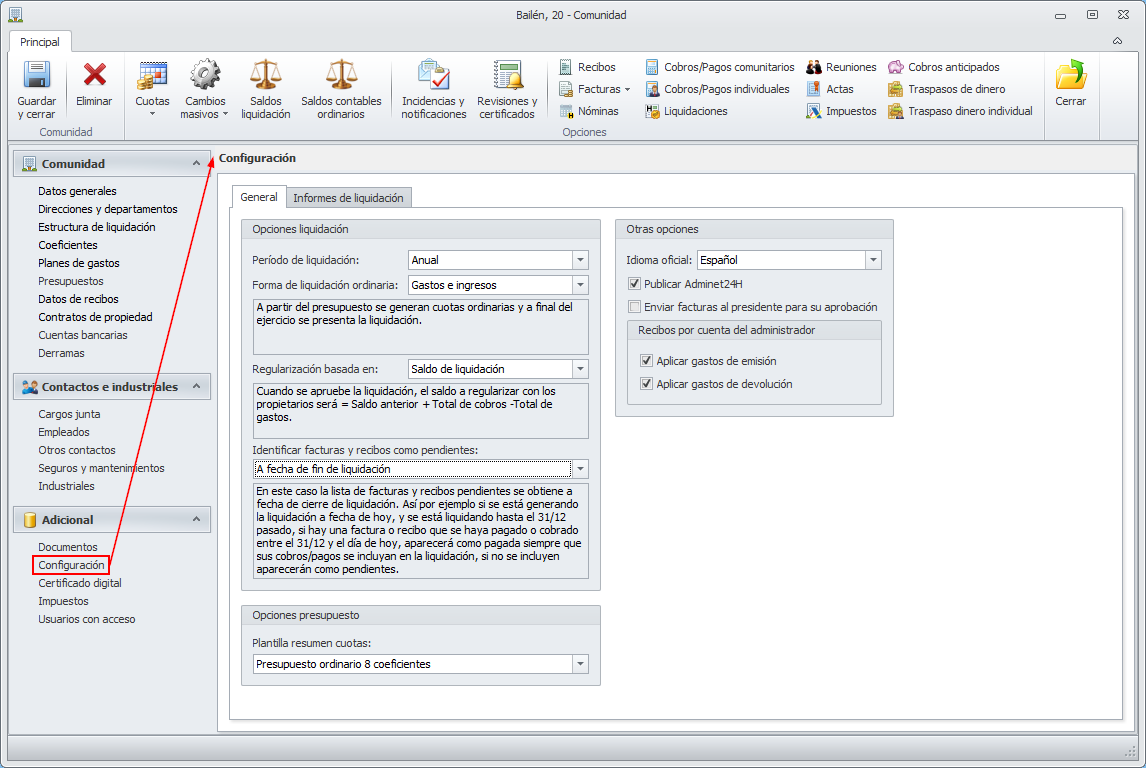 En la sección Configuración debe especificar características relacionadas con el aspecto que deben tener las liquidaciones, presupuestos y recibos de esta comunidad.