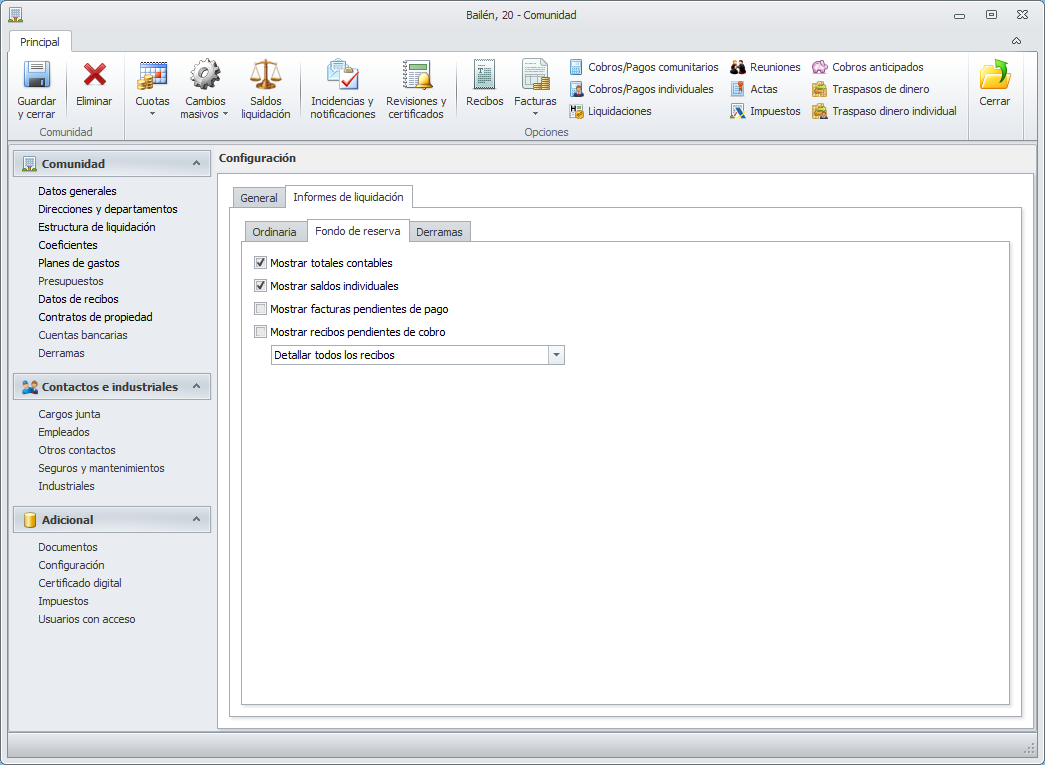 Incluir liquidación del fondo de reserva: Si activa esta casilla y la comunidad tiene activo el fondo de reserva, tras el informe de la liquidación ordinaria se añade una liquidación del fondo de reserva comprendida entre las mismas fechas que la liquidación ordinaria.