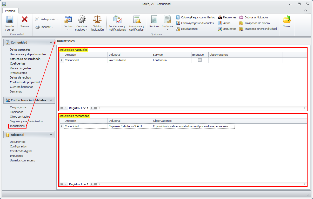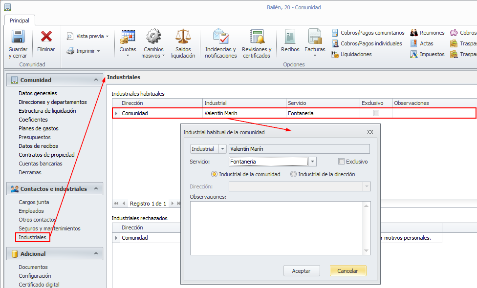 En la sección Industriales de la ficha de la comunidad se detallan aquellos industriales relacionados con la misma y que son utilizados para asignarlos a las tareas de las incidencias.
