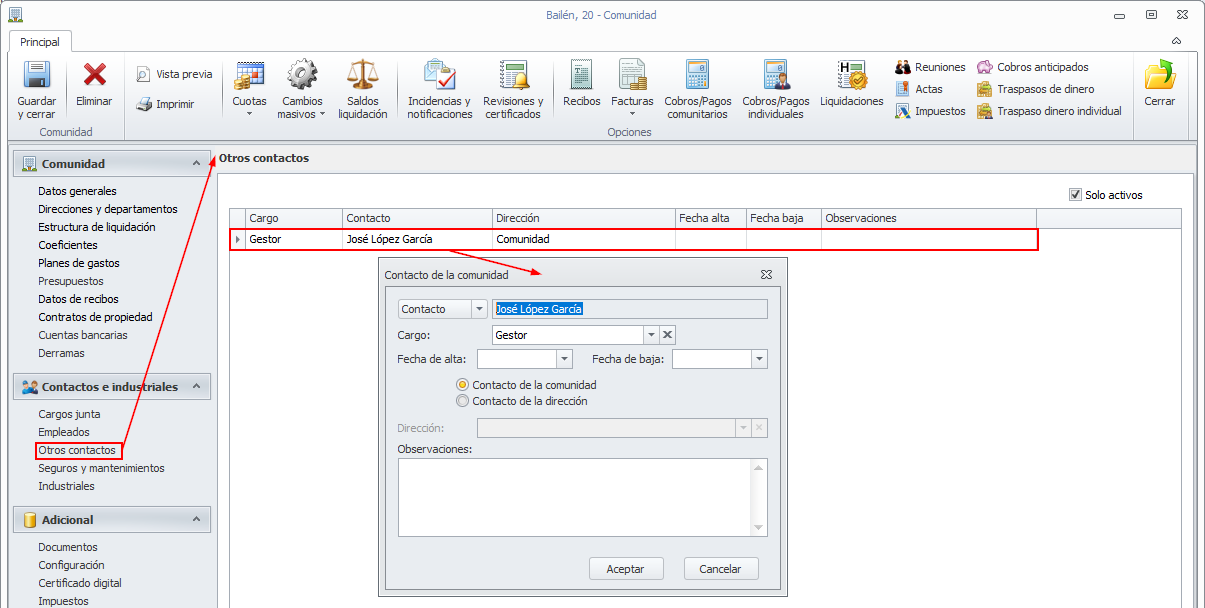 En la sección Otros contactos de la ficha de la comunidad, se muestran los datos otras personas relacionadas con la comunidad y que no son ni cargos de la junta, ni empleados ni industriales, ni responsables de seguros o mantenimientos.