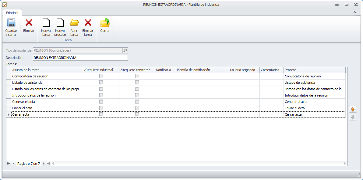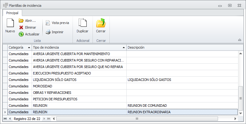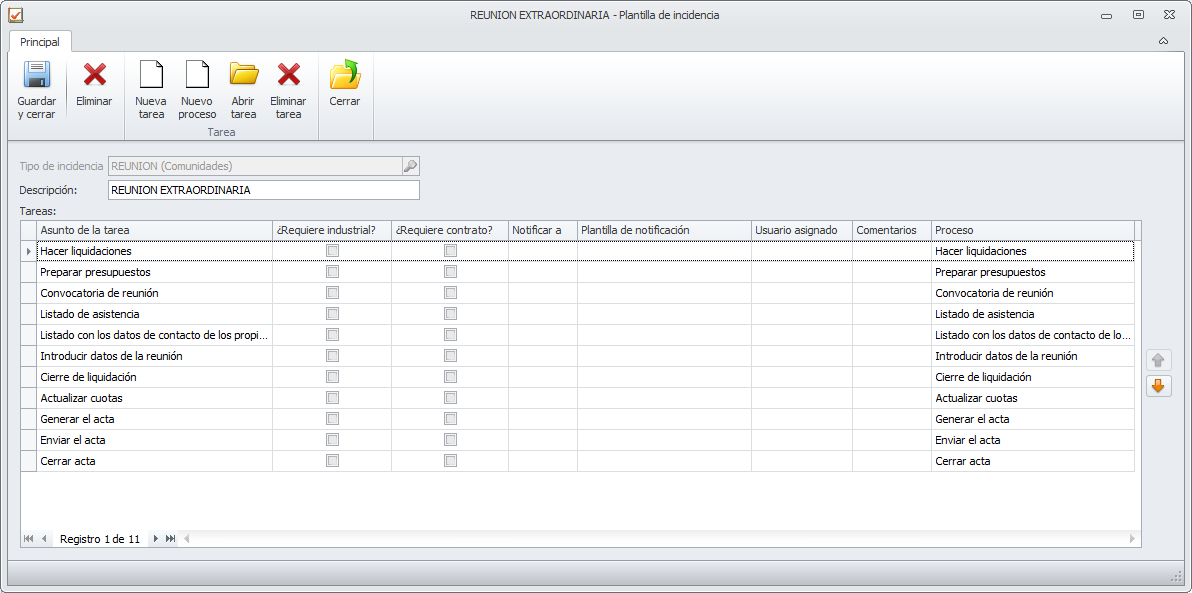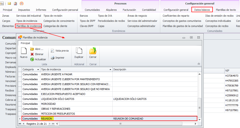 A continuación, desde el menú Datos básicos, vaya a Plantillas de incidencia y localice aquellas cuyo tipo de incidencia coincida con el consultado anteriormente. En nuestro ejemplo, sólo hay una para el tipo REUNION.