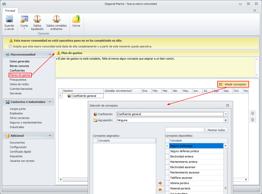 Vaya a la sección Planes de gastos. Se muestra la lista de coeficientes introducidos para que añada los conceptos a cada uno de ellos. Hágalo mediante el botón Añadir conceptos.