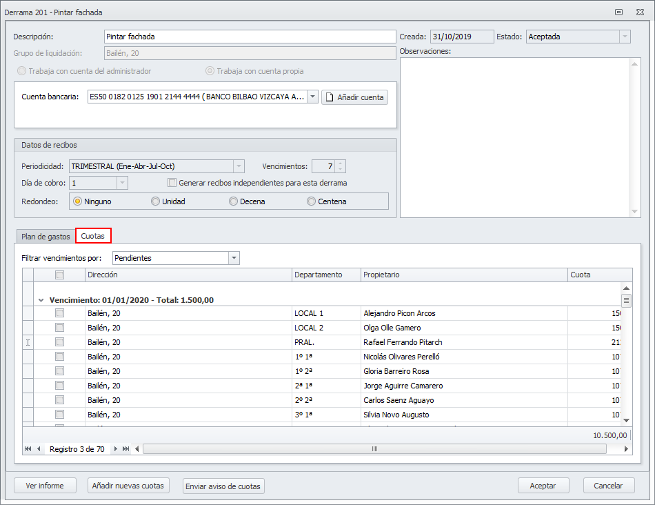Abra la ficha de la derrama. Acceda a la pestaña Cuotas.